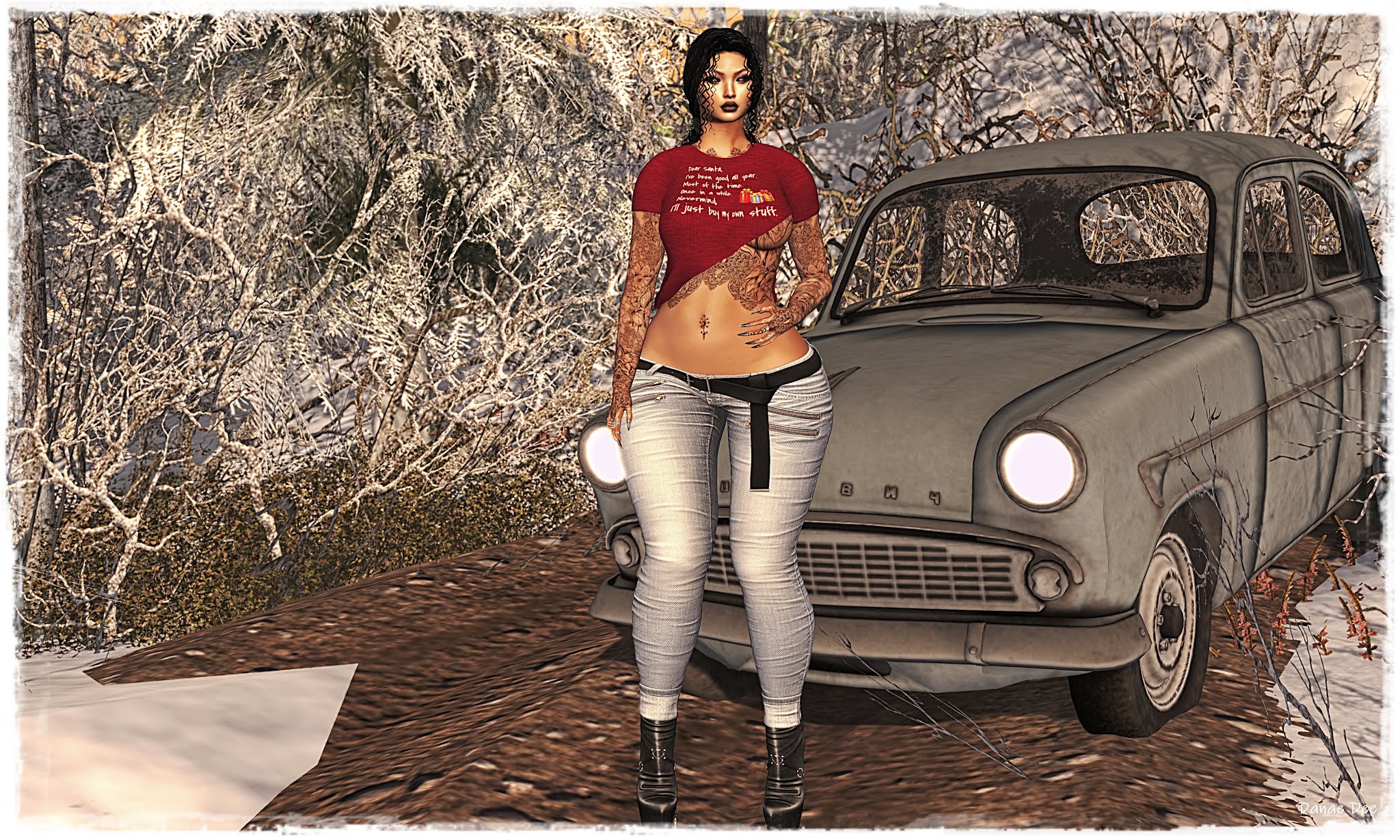 Driving Home Body: Maitreya Lara Head: Catwa Catya Tattoo: leven Ink Keres Clothing: Blueberry – Tink, EQUAL – Liana Ankle